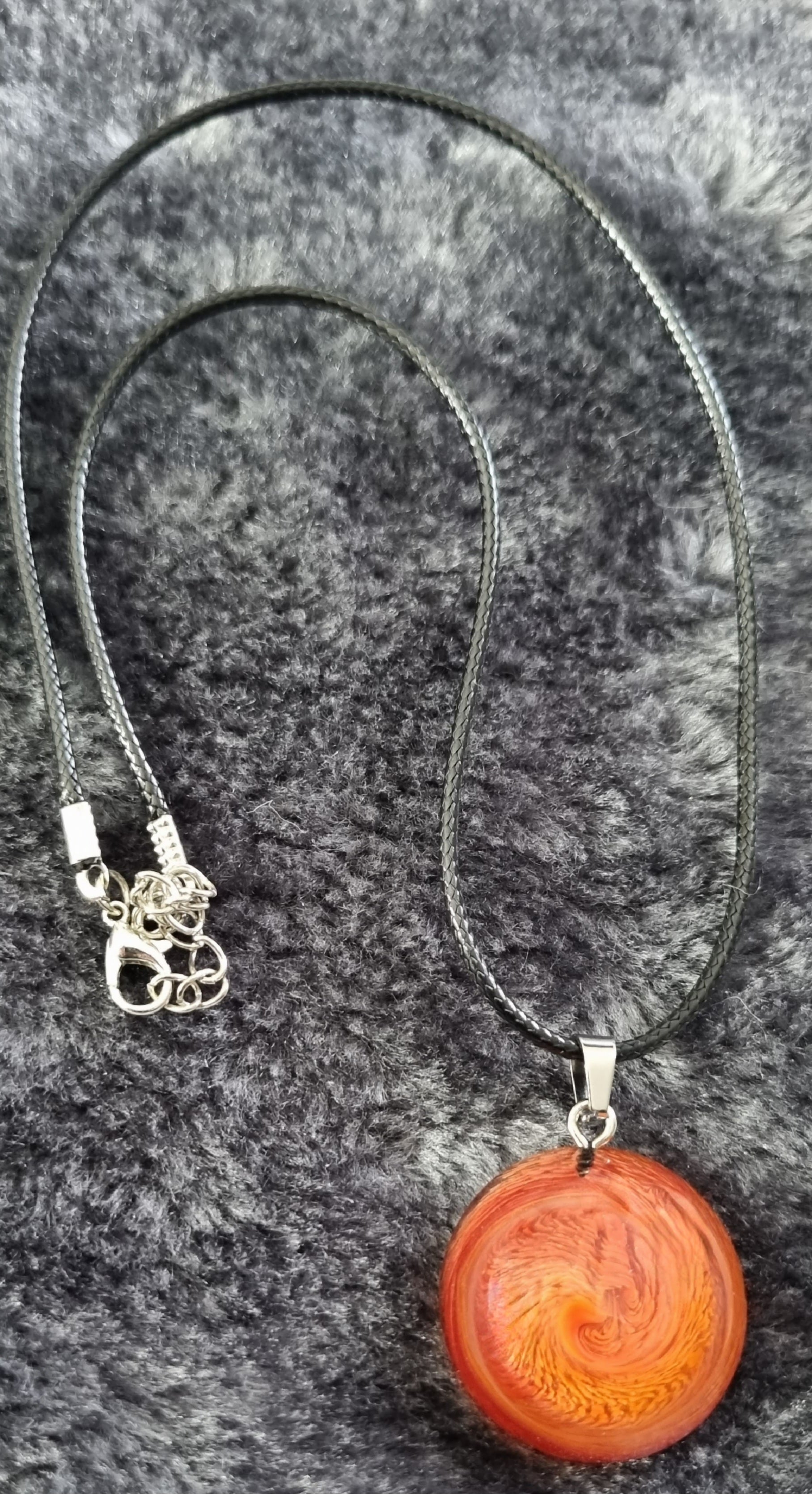 Add a touch of elegance to your outfit with this beautiful round-shaped resin pendant necklace. Featuring vibrant orange tones, this unique piece has been made using the petri technique, which creates unpredictable and beautiful patterns within the resin. The black waxed necklace cord is smooth and durable and has a secure lobster clasp.
