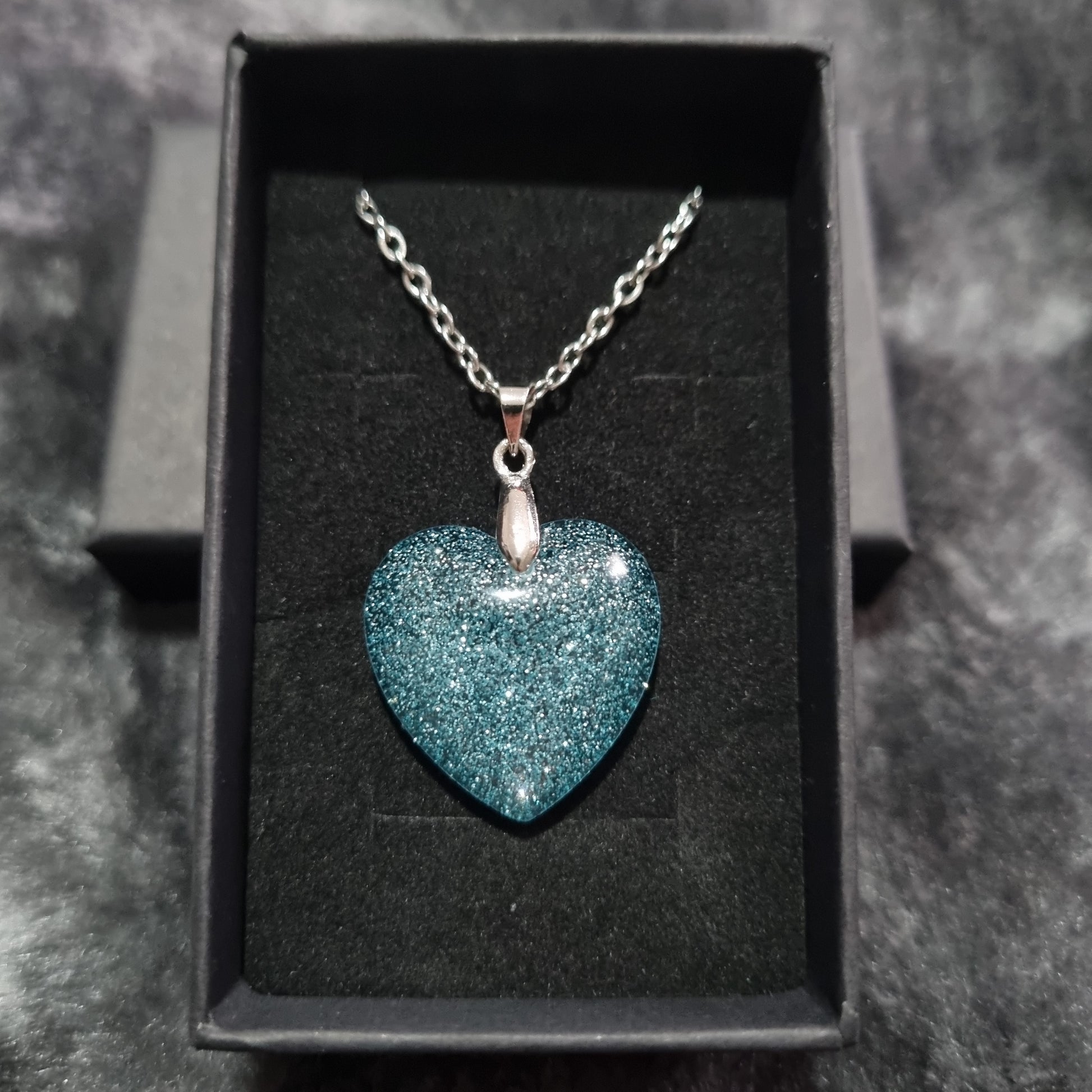 Add a touch of elegance to your outfit with this sparkly blue heart-shaped resin pendant necklace. The chain is made from a sleek, durable and hypoallergenic stainless steel.